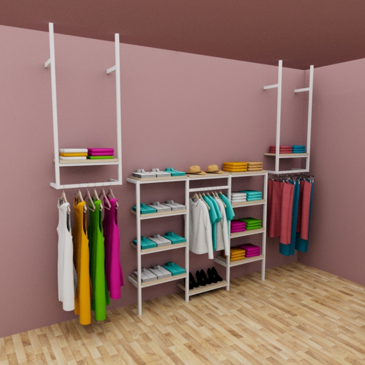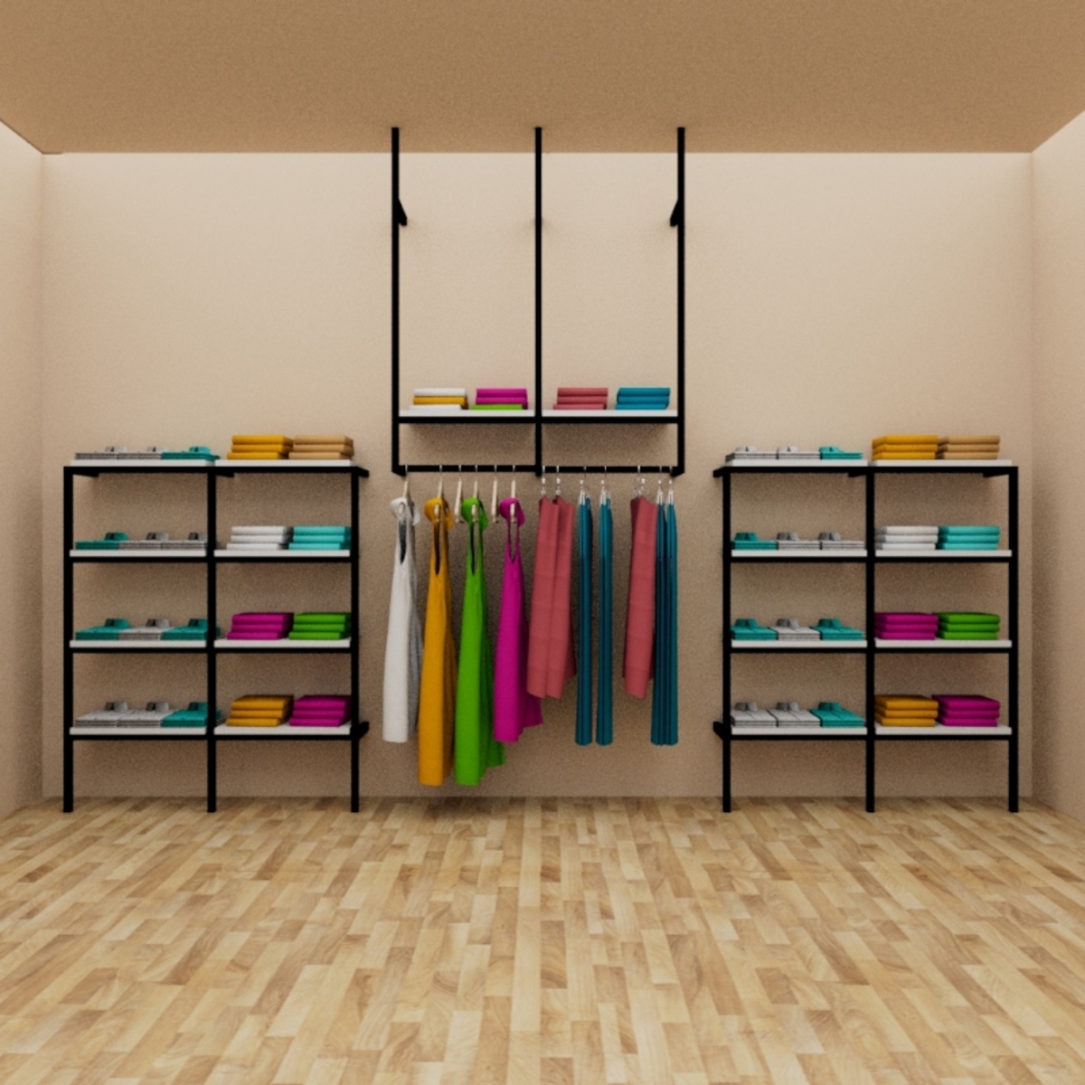 Parete con Sistema Flexi con piani in legno nobilitato. questo sistema pò essere disposto sia a terra, che a soffitto, per rendere il tuo ambiente unico!